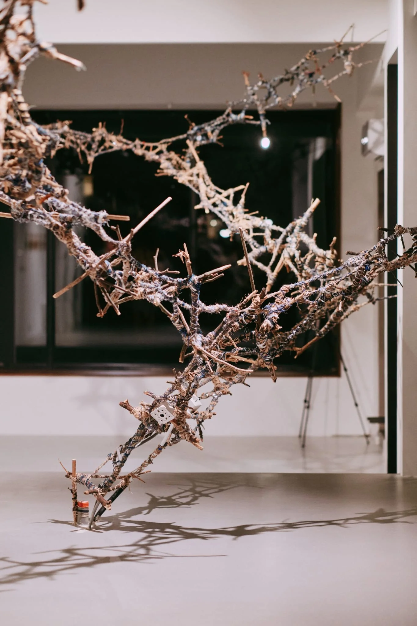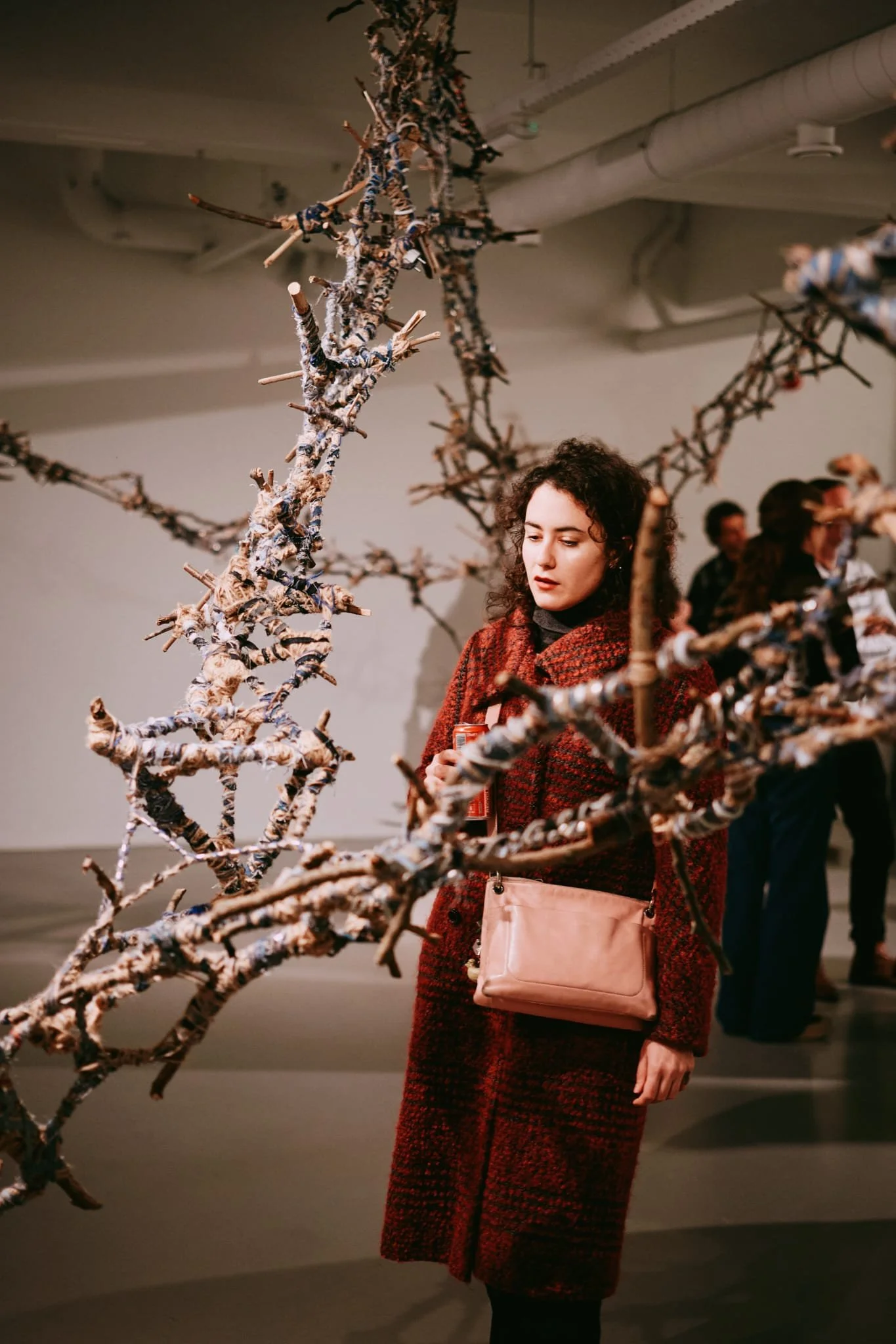 The Luxury of Inefficiency is a large-scale installation that unfolds across more than seventy metres of space, constructed from over fifty thousand metres of rope alongside branches, electrical waste, textile remnants, construction debris, and discarded plastics. These materials, the by-products of a culture built on constant production and consumption, form a vast, warped structure that visitors can move through and experience from within. The work took eighteen months to produce and is built entirely through manual processes. Every element is tied, twisted, stretched, and held in tension by hand. The physical labour embedded in the installation is central to its meaning. In a cultural moment increasingly defined by speed, productivity, and optimisation, the work deliberately embraces slowness. At its core, the installation reflects on some of humanity’s earliest technologies: rope, textiles, gathered branches, and the act of making with the hand. These simple materials and techniques allowed humans to survive, organise, and build the foundations of society. The line, the most basic connection between two points, forms the structural and conceptual basis of the work. For over a decade, the line has been a central language in Kelly’s practice, functioning as a tool for drawing in space, constructing form, and exploring relationships between labour, material, and environment. While visually complex and immersive, The Luxury of Inefficiency also carries a political dimension. The work questions a system that relentlessly prioritises efficiency and productivity while simultaneously shifting the responsibility for environmental change onto individuals. In contrast, the installation proposes a slower, more reflective mode of making, one that values time, effort, and attention. In a world obsessed with efficiency, choosing slowness becomes a quiet act of resistance.